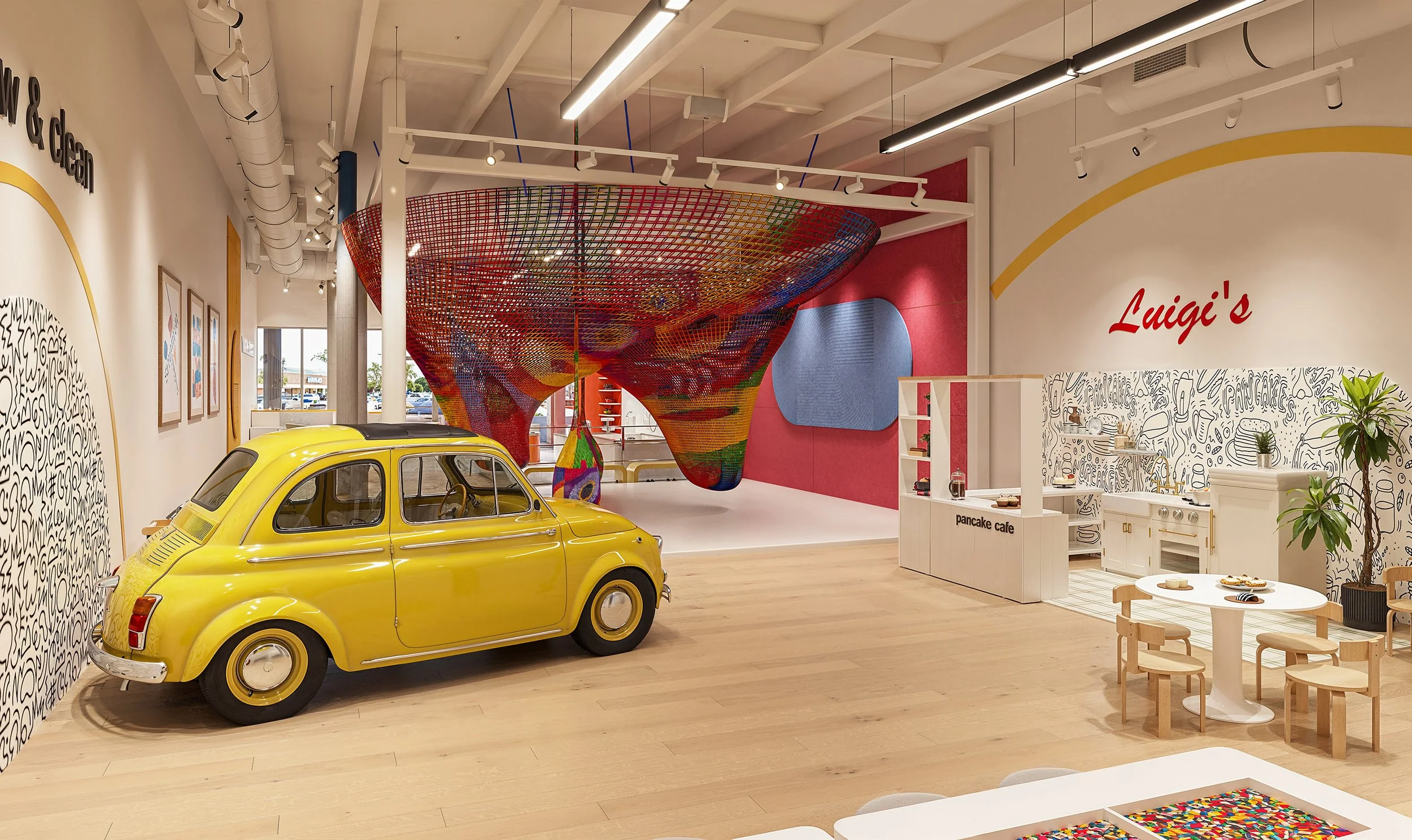 Lighting spheres, RC boat waterways, Climbing Nets, a car wash station of real Vintage Fiat 500,
